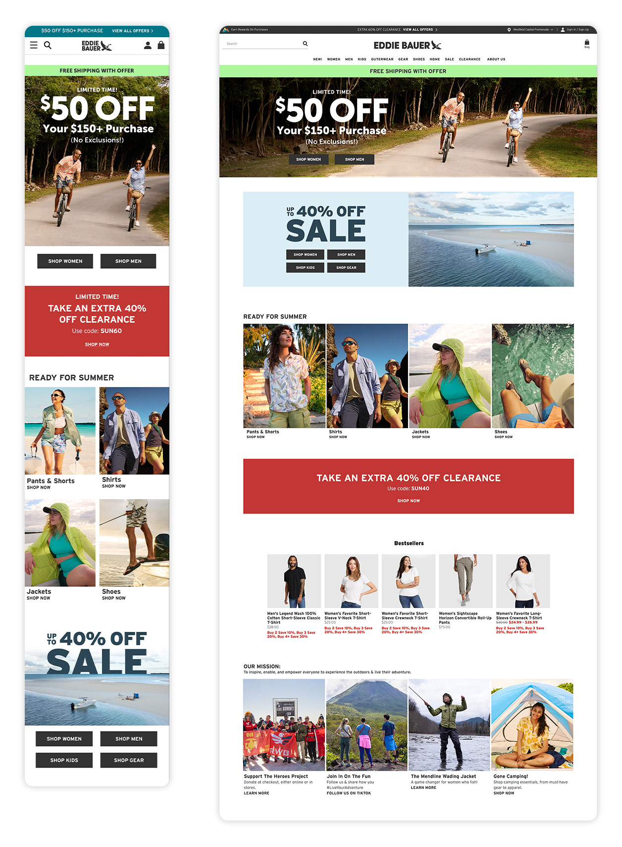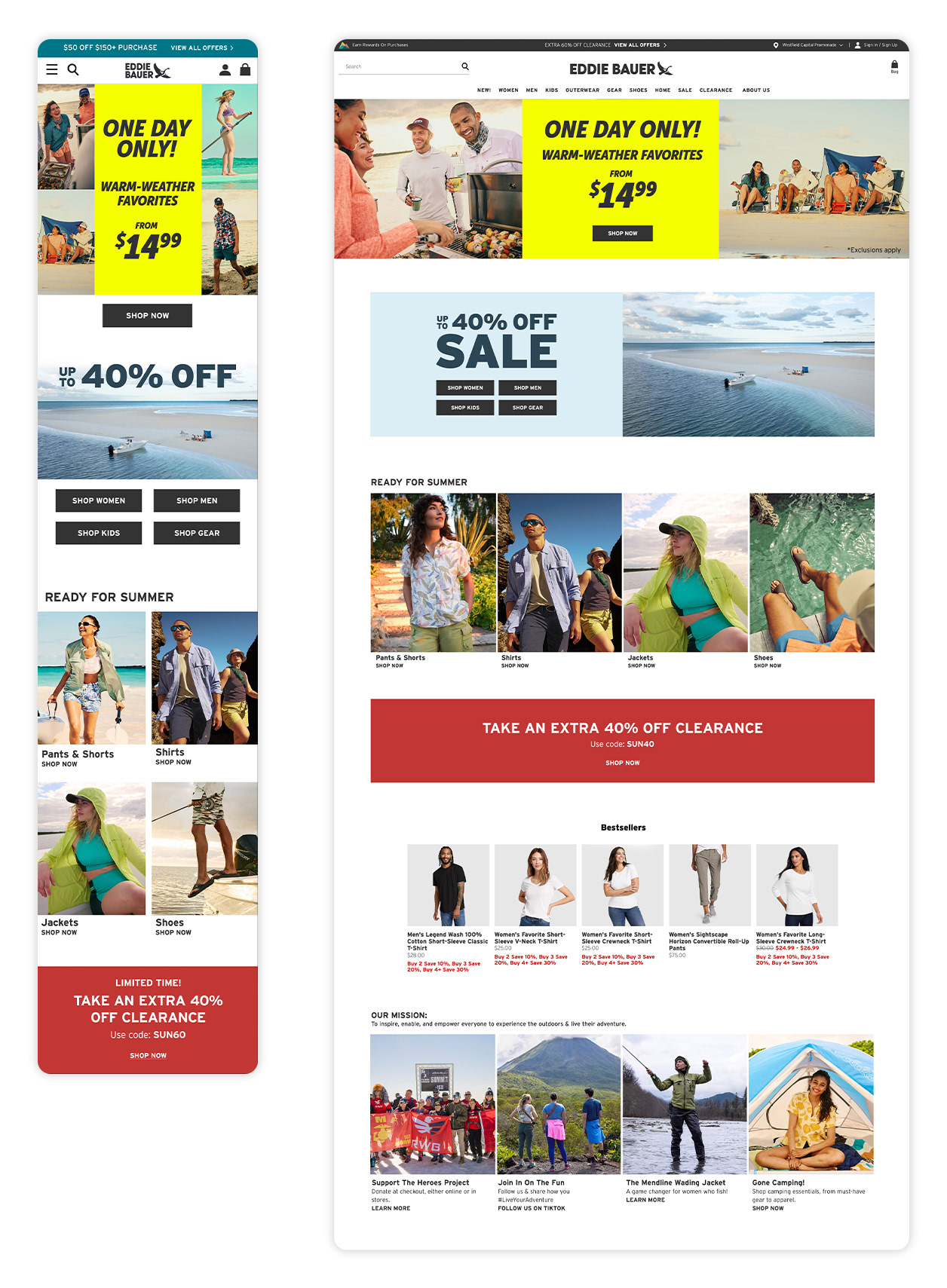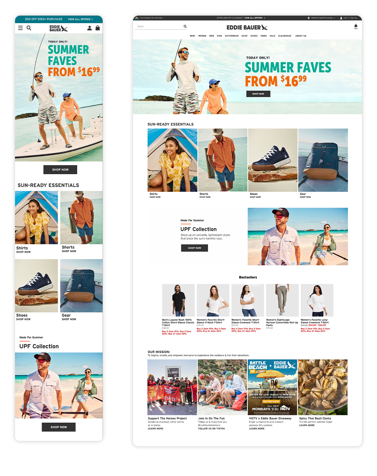 From there, I source imagery through our digital asset management system, validate product availability on the live site to avoid user friction, and begin designing assets in Photoshop. Throughout the design process, I explore multiple variations, considering layout, visual hierarchy, and clarity to ensure the content is both engaging and easy to navigate.